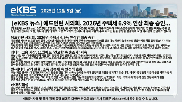 2025년 12월 5일, 에드먼턴 시의회가 2026년 예산안을 최종 확정하며 주택 소유주들에게 직접적인 영향을 미치는 주요 결정을 내렸습니다. 또한, 캐나다 연방 경제의 고용 보고서와 한-캐나다 경제 교류의 주요 지표인 환율 동향을 점검하여 교민 여러분께 전달해 드립니다.