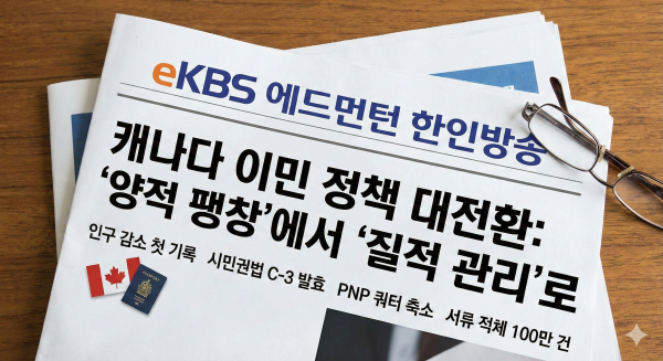 캐나다 연방 정부의 이민 정책 기조가 기존의 '확장'에서 '축소 및 관리'로 완전히 돌아서며 새로운 국면을 맞이하고 있습니다. 팬데믹 이후 처음으로 인구가 감소세로 돌아섰다는 통계청의 발표와 함께, 시민권법 개정 등 굵직한 변화들이 잇따르며 이민 시장의 판도가 흔들리고 있습니다. eKBS가 현재 급변하는 이민 시장의 주요 흐름을 상세히 짚어봤습니다.