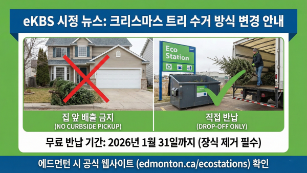 2026년 1월 2일 기준 에드먼턴 시의 안내에 따르면, 올해부터 자연산 크리스마스 트리에 대한 가정 방문 수거가 중단되었습니다. 그동안 쓰레기 수거일에 맞춰 집 앞에 트리를 내놓으면 시에서 수거해갔던 방식이 폐지된 것입니다.