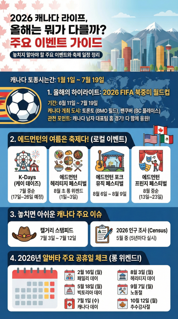 에드먼턴 교민 여러분, 그리고 캐나다의 다이나믹한 2026년을 즐길 준비가 되신 분들을 위해 올해 꼭 체크해야 할 주요 이벤트와 축제 일정을 정리해 드립니다. 달력에 미리미리 표시해 두세요!