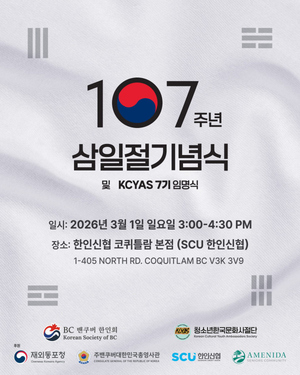 BC밴쿠버한인회가 오는 3월 1일, 민족의 독립 의지를 전 세계에 알렸던 삼일절 107주년을 맞아 뜻깊은 기념식을 개최합니다. 특히 이번 행사는 한인 사회의 미래를 책임질 청소년 리더들의 모임인 '청소년한국문화사절단(KCYAS)' 제7기 임명식이 함께 열려 세대를 아우르는 화합의 장이 될 전망입니다.